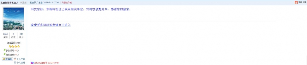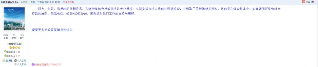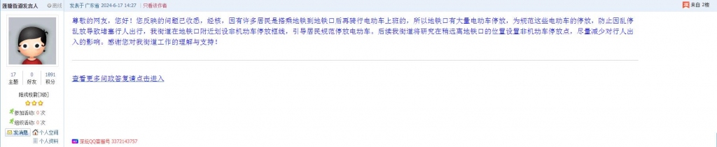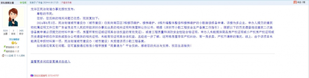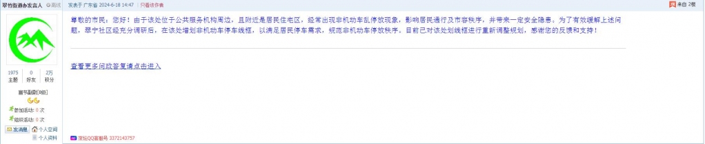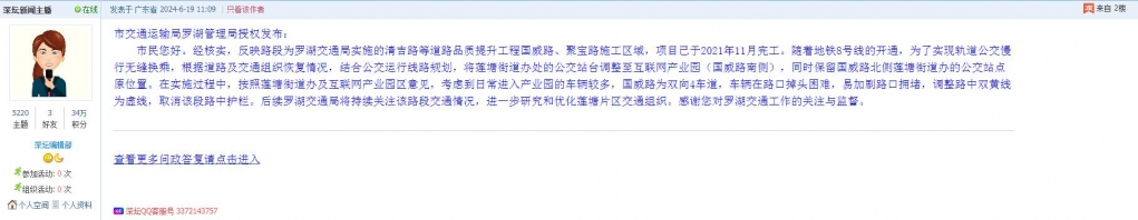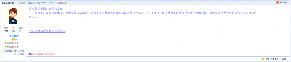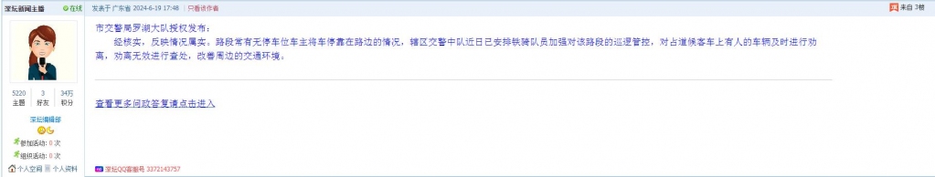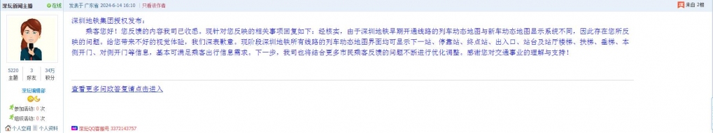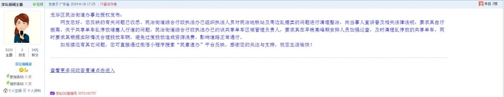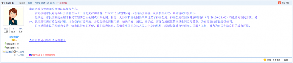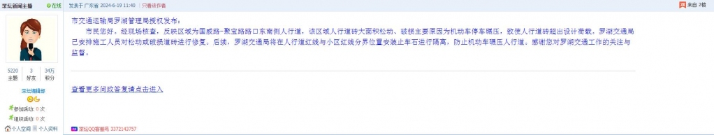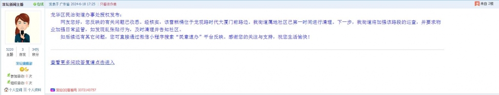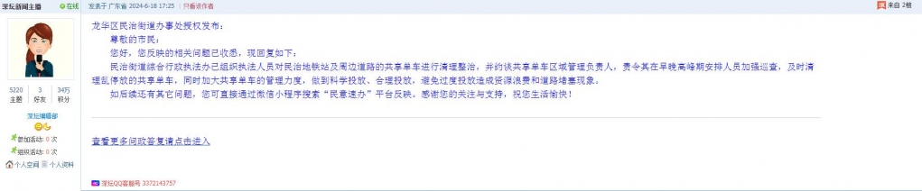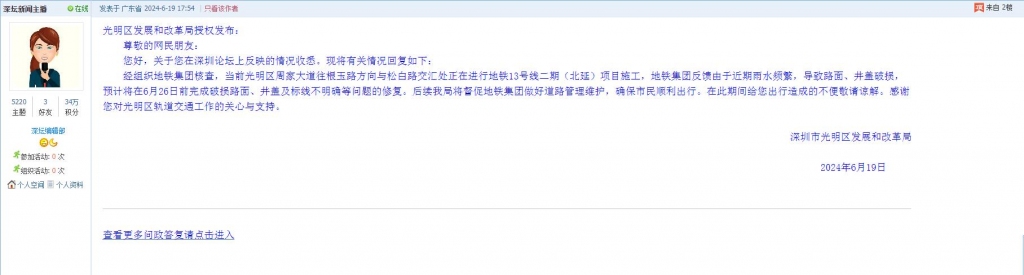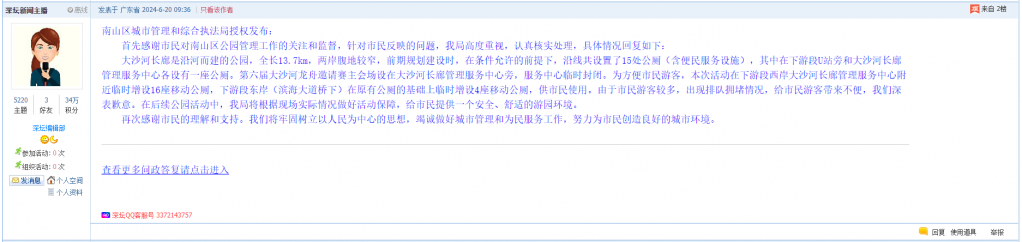 各职能单位如需对网友反映的问题进行回应,可在深圳论坛注册官方账号并通过认证,回帖进行回应。