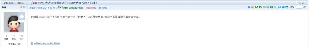 21、帖文《大沙河绿道周边的扫码收费厕所收入归谁?》