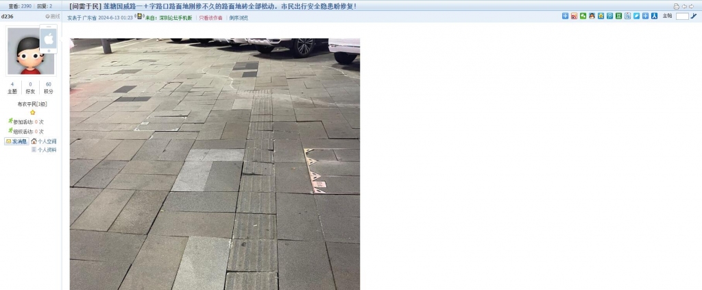 7、帖文《莲塘国威路一十字路口地面砖块几乎全部松动,市民出行安全隐患多》