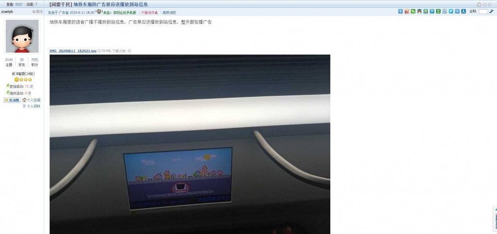 4、帖文《地铁车厢的广告屏应该播放到站信息》