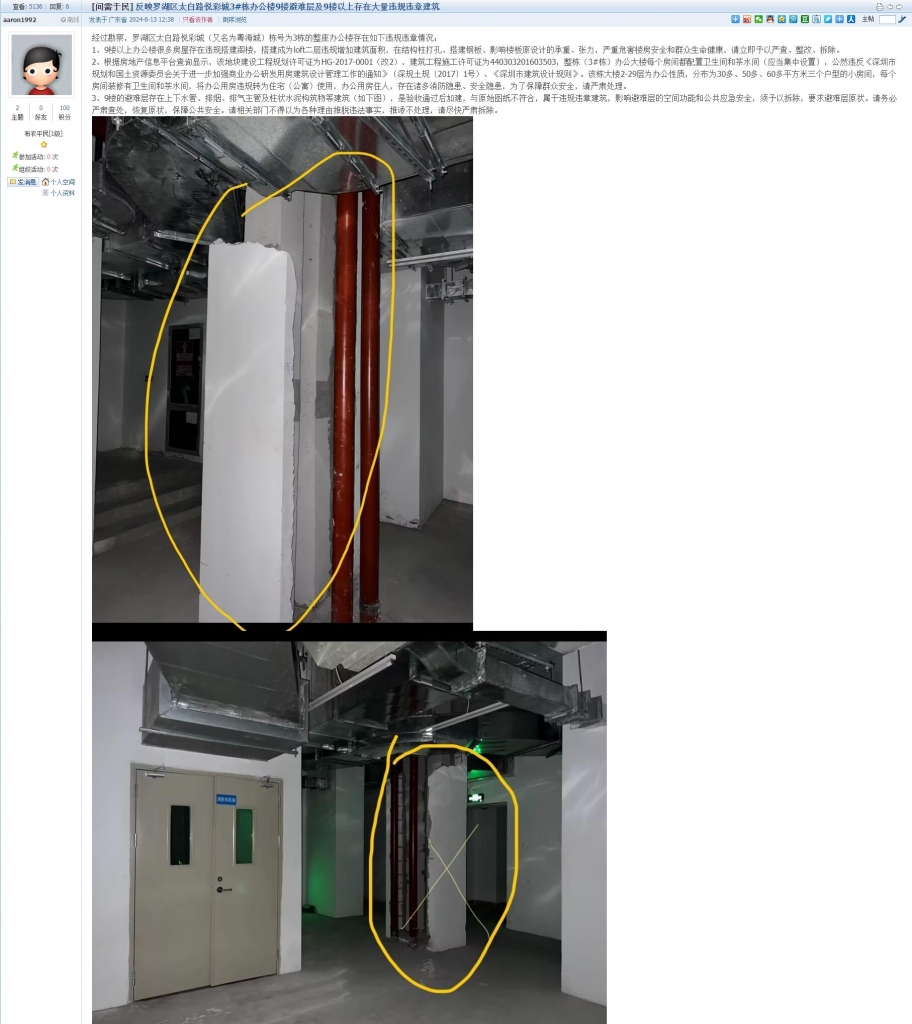 12、帖文《反映罗湖区太白路悦彩城3#栋办公楼9楼避难层及9楼以上存在大量违规违章建筑》