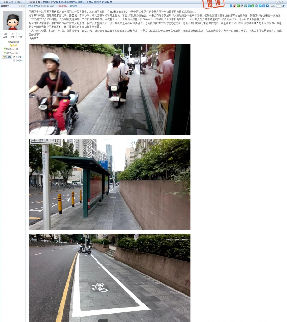 14、帖文《罗湖区太宁路非机动车停放点设置不合理安全隐患大风险高》