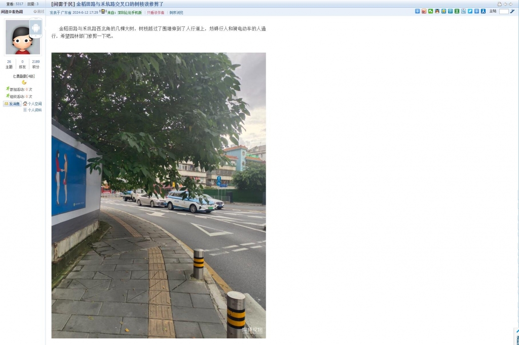 9、帖文《金稻田路与禾坑路交叉口的树枝该修剪了》