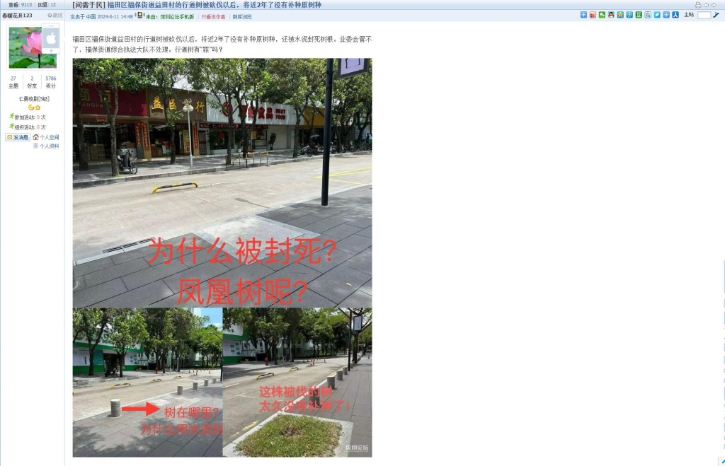 2、帖文《福田区福保街道益田村的行道树被砍伐以后,将近2年了没有补种原树种》