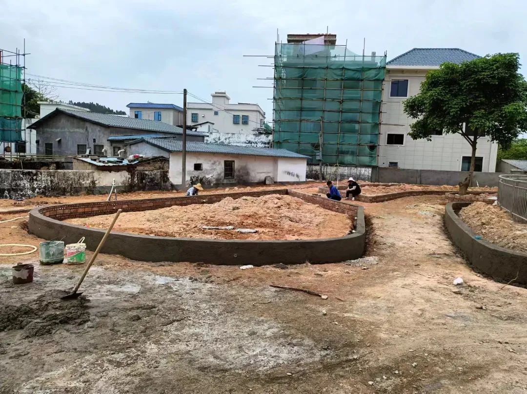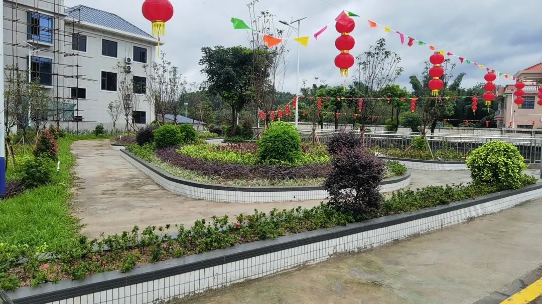 这个占地约1500平方米的乡村公园,绿植共500余棵,包括紫花风铃木、红继木、簕杜鹃、黄榕球等,呈现出错落有致、生机盎然的效果。原有风水塘通过水质净化、排水管道完善,增设石板石凳、文化墙,升级成为一处活力焕发的景观湖。