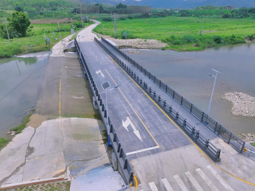 近日,赤石镇塘尾村和江仔下村原有的两段漫水路段上出现了两座崭新的临时钢便桥,桥面平整宽阔,人行道与行车道间设置了防撞护栏,还安装了太阳能路灯照明……