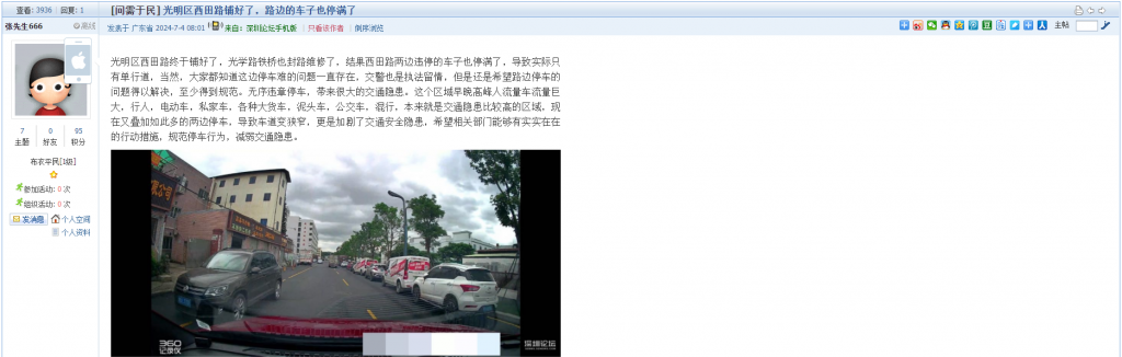 7. 帖文《光明区西田路铺好了,路边的车子也停满了》