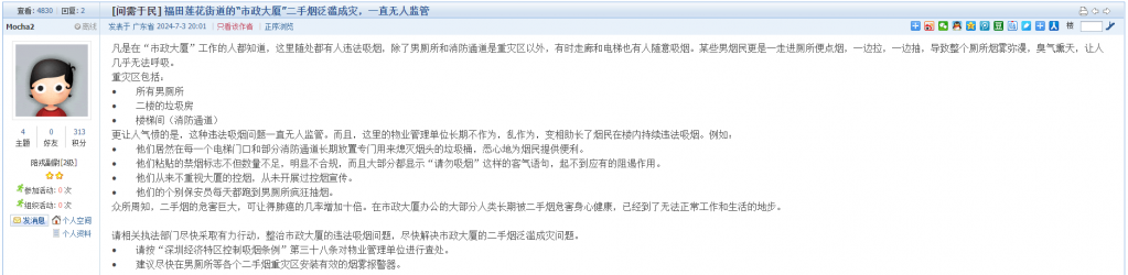 18. 帖文《福田莲花街道的“市政大厦”二手烟泛滥成灾,一直无人监管》