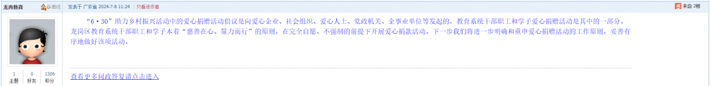 “6·30”助力乡村振兴活动中的爱心捐赠活动倡议是向爱心企业、社会组织、爱心人士、党政机关、企事业单位等发起的,教育系统干部职工和学子爱心捐赠活动是其中的一部分。龙岗区教育系统干部职工和学子本着“慈善在心、量力而行”的原则,在完全自愿、不强制的前提下开展爱心捐款活动。下一步我们将进一步明确和重申爱心捐赠活动的工作原则,妥善有序地做好该项活动。