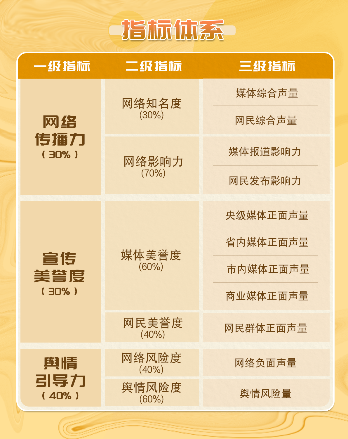 《深圳各街道网络形象及影响力榜》具有科学、可信、量化的指标评价体系,能够全面客观地评估各街道的网络综合形象及影响力值。具体指标体系如下图所示↓