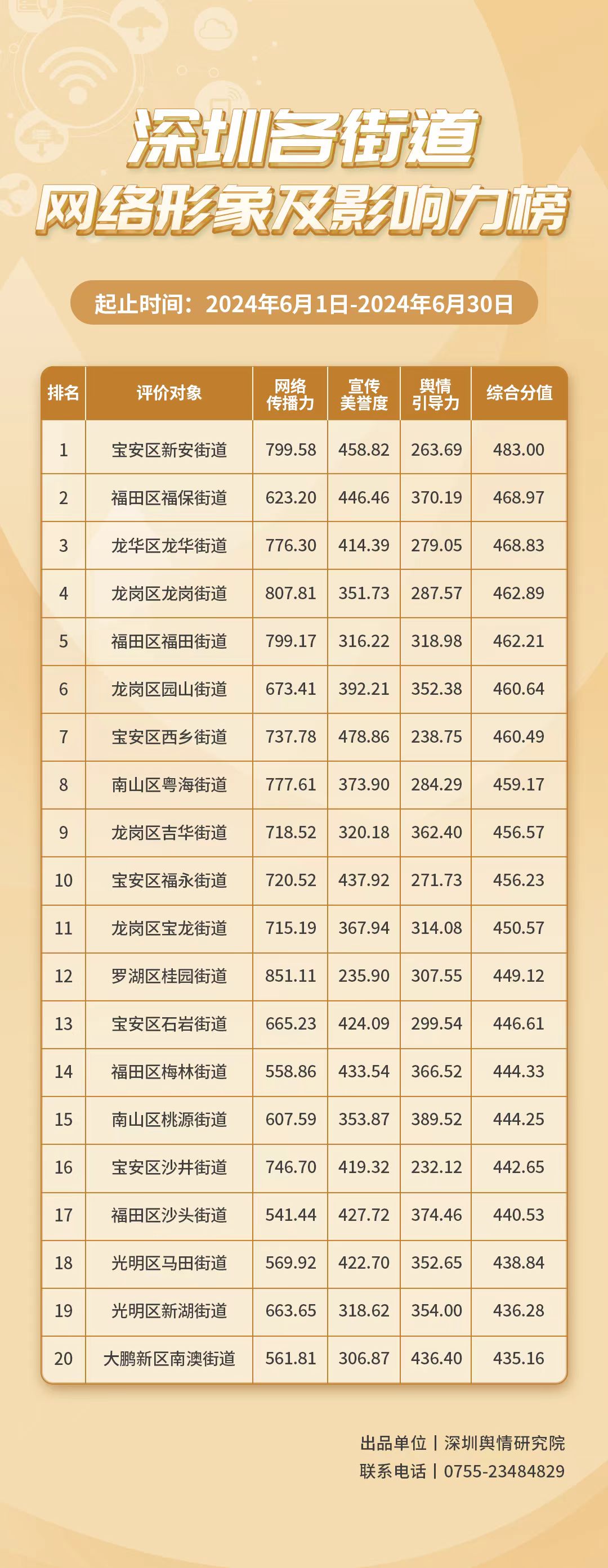 2024年6月,共有20个街道登上《深圳各街道网络形象及影响力榜》,分别是:宝安区新安街道、福田区福保街道、龙华区龙华街道、龙岗区龙岗街道、福田区福田街道、龙岗区园山街道、宝安区西乡街道、南山区粤海街道、龙岗区吉华街道、宝安区福永街道、龙岗区宝龙街道、罗湖区桂园街道、宝安区石岩街道、福田区梅林街道、南山区桃源街道、宝安区沙井街道、福田区沙头街道、光明区马田街道、光明区新湖街道、大鹏新区南澳街道。