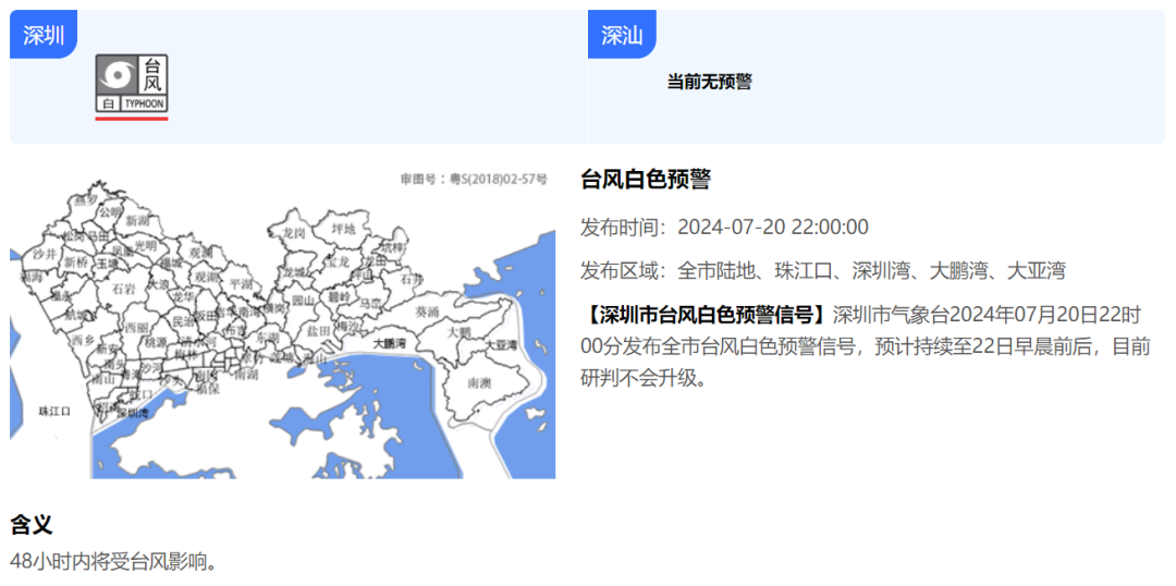 深圳市气象台2024年07月20日22时00分发布全市台风白色预警信号,预计持续至22日早晨前后,目前研判不会升级。