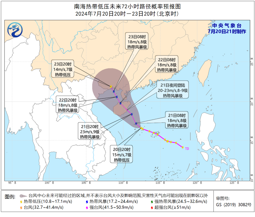 20日20时南海热带低压位于深圳偏南方约684公里的南海中部,预计未来将以5-10公里的时速向西北方向移动,强度逐渐增强,可能于24小时内发展为编号台风(最高为热带风暴级),并将于21日夜间到22日早晨在海南岛东部到广东西部一带沿海登陆,预计登陆时强度为热带风暴级(8-9级,20-23米/秒),随后穿过海南岛,22日上午移入北部湾。