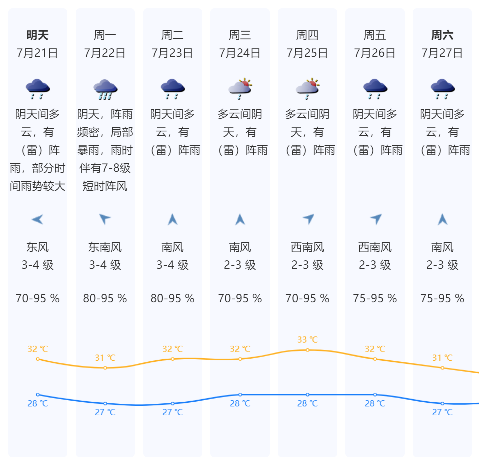 21-22日多间歇性(雷)阵雨,局地有暴雨风险,雨时伴有7-8级最大阵风;