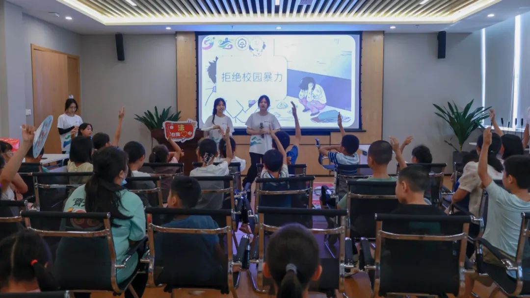 7月23日上午,区党群服务中心。广东交通职业技术学院学生开办的“青言普法”公益课堂上,30多名小朋友听得津津有味。