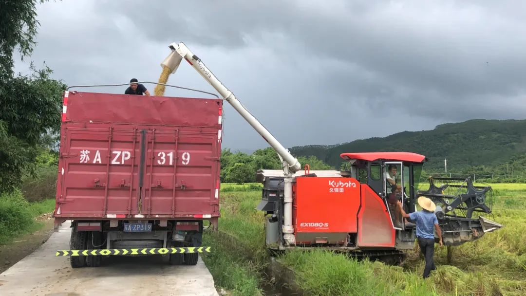 一车收割结束后,脱粒的稻谷就顺着输送管道哗哗“流”进路旁等候的运粮车中,不一会儿就装了满满一车。看着田间小路上一辆辆运粮车满载而出,深汕土地管理公司明热村农田管护江伟汉的脸上挂满笑容。“今年早稻插秧时间比往年提早了20天左右,在6月强降水来临之前,大部分田块已抽穗扬花,避开了‘雨洗禾花’。”他介绍说。