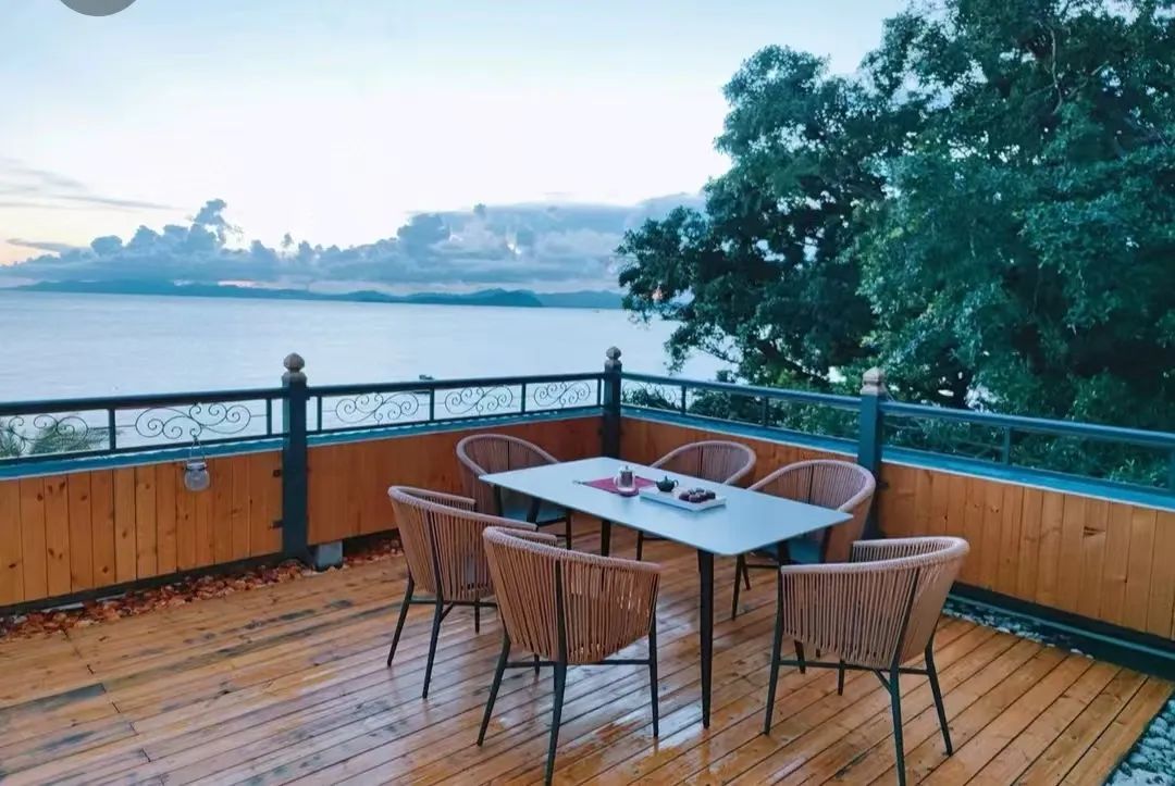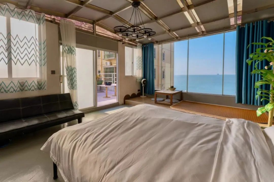 进入客厅,就能看到一张3米多长的实木茶桌,坐在桌边泡泡茶,聊聊天,无比惬意。房间家具主打原木风,两个卧室楼上还设有阁楼,阁楼上摆着榻榻米,足够一家人旅游居住。民宿内还配备了海景休闲餐吧,坐在窗边,看着大海发呆,绝对是很多人理想的休闲场景。