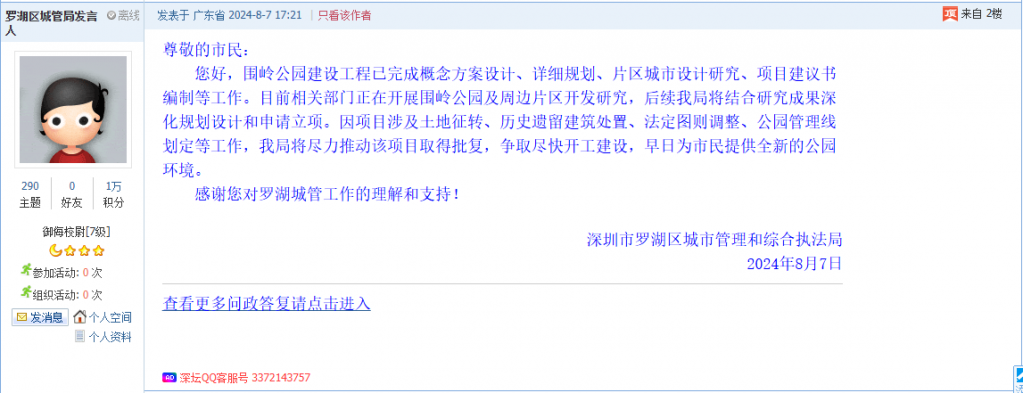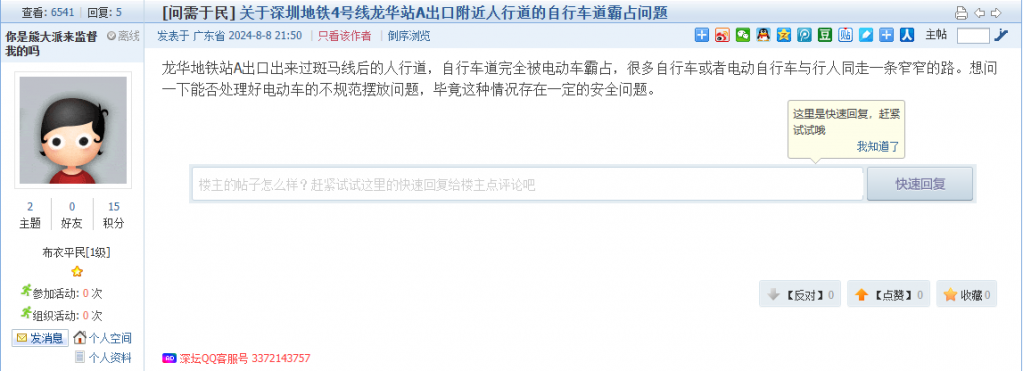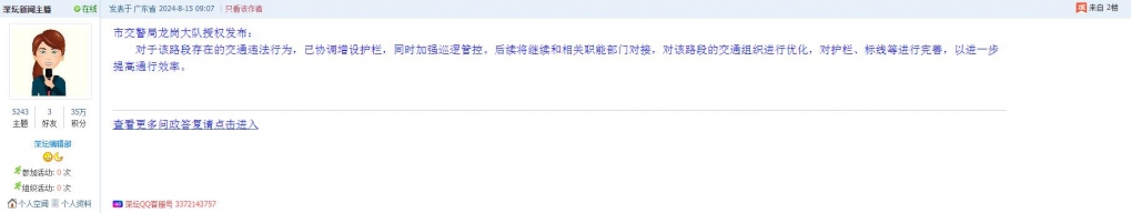 各职能单位如需对网友反映的问题进行回应,可在深圳论坛注册官方账号并通过认证,回帖进行回应。
