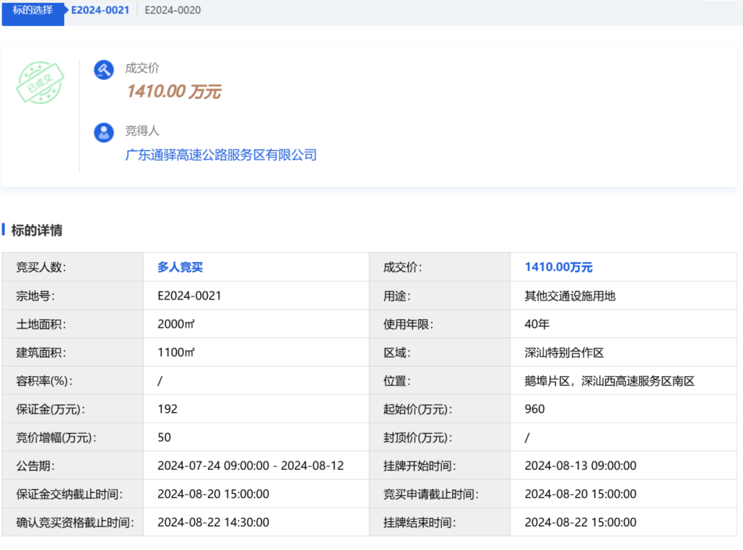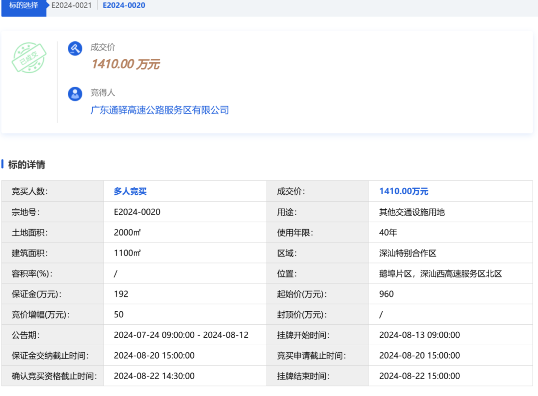 由广东通驿高速公路服务区有限公司竞得