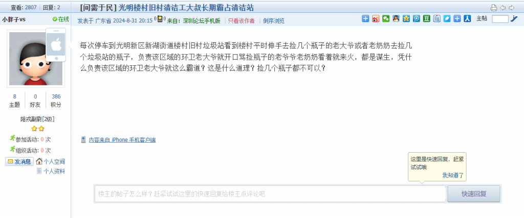 14. 帖文《光明楼村旧村清洁工大叔长期霸占清洁站》