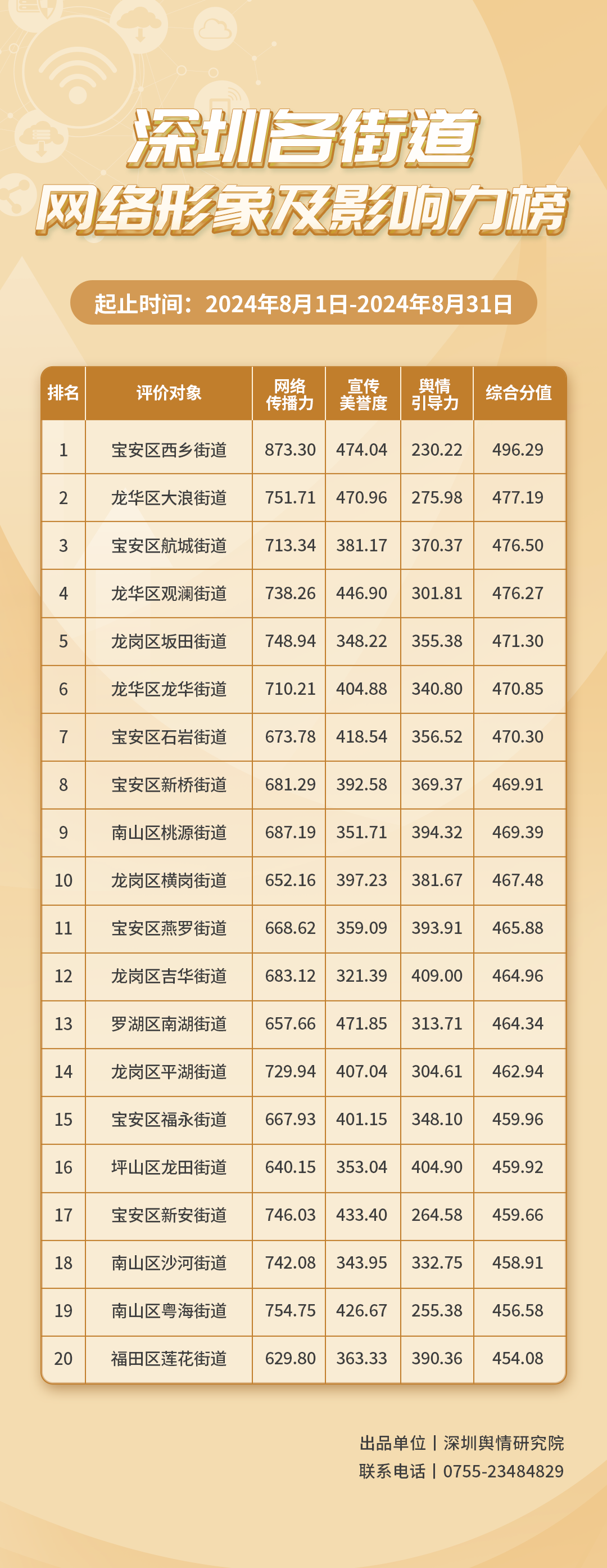 2024年8月,各街道不断探索治理新路径,力求效能跃升,《深圳各街道网络形象及影响力榜》(8月榜单)发布,为您揭晓哪些街道网络形象治理实效显著,成标杆,本期榜单数据统计范围为2024年8月1日至8月31日。
