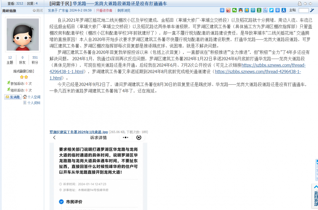 3. 帖文《华龙路——龙岗大道路段道路还是没有打通通车》《草埔东片区拥堵二十多年了》《悦峰华府小区居民每天拥堵到无法出行》