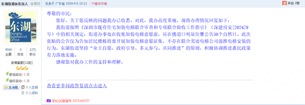 我街道按照《深圳市既有住宅加装电梯联合审查和专项联合验收工作指引》(深建房安[2024]9号)中的相关规定:街道办事处在收集加装电梯意愿前,应在楼道口明显位置公告30个自然日。此次张贴的公告仅为告知居民楼栋将要开展加装电梯意愿征集,不存在联合劣迹电梯公司强推电梯安装的行为。东湖街道坚持“业主自愿、政府引导、多元参与、共同推进”的原则,积极协调推进惠民政策有力落地实施。