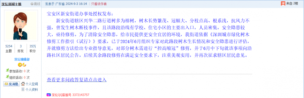 新安街道辖区兴华二路行道树多为榕树,树木长势繁茂、冠幅大、分枝点高、根系浅,抗风力不强,曾发生树木断枝事件,且该路段沿线有学校、住宅小区的主要出入口,人员密集,安全隐患较大,亟待修剪。为了清除安全隐患,给市民提供更安全宜居的环境,我街道依据《深圳城市绿化树木修剪工作指引(试行)》要求,已于2024年6月组织专家对此路段树木生长情况和安全隐患进行评估,并就修剪方法给出专业指导意见,对部分树木需进行“控高缩冠”修剪,并于6月中下旬就该事项向沿路社区居民公告。后续其余路段修剪在满足安全要求下,注重美观实用,并再次征求辖区居民意见。