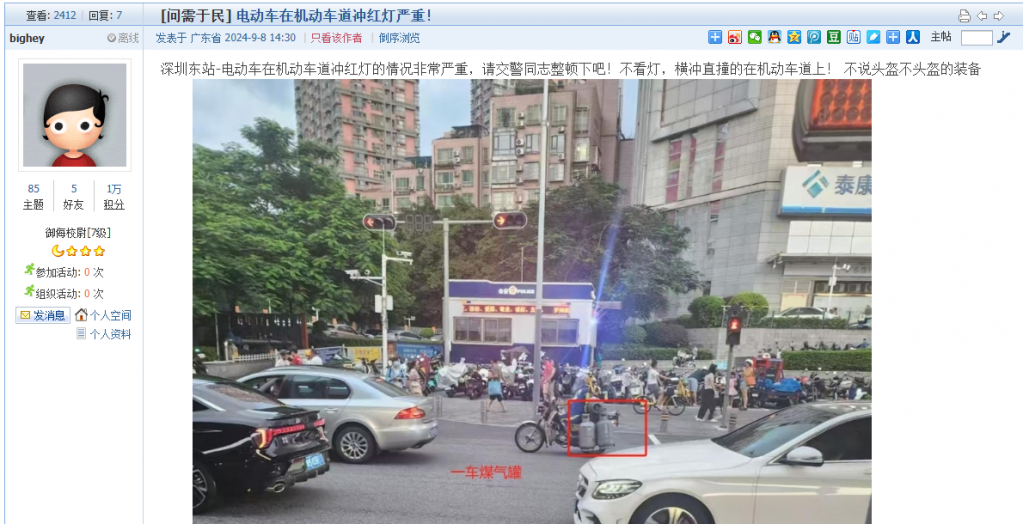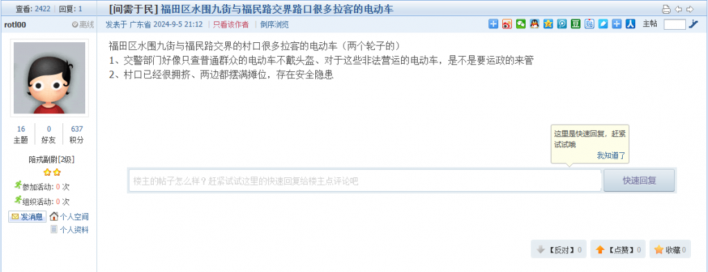 19. 帖文《福田区水围九街与福民路交界路口很多拉客的电动车》