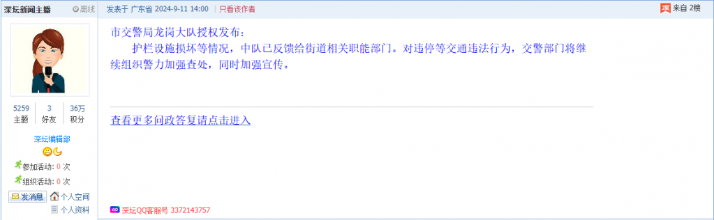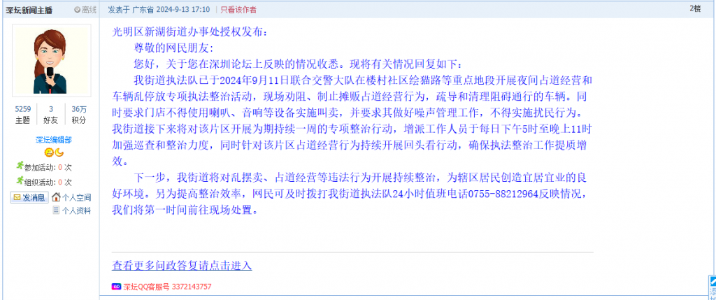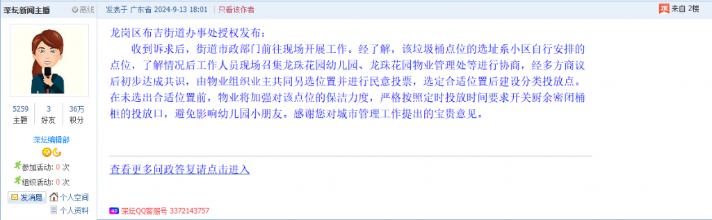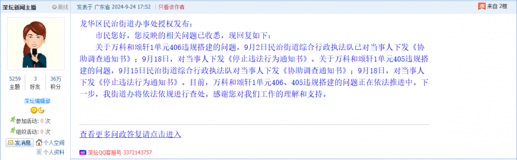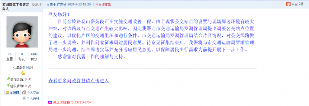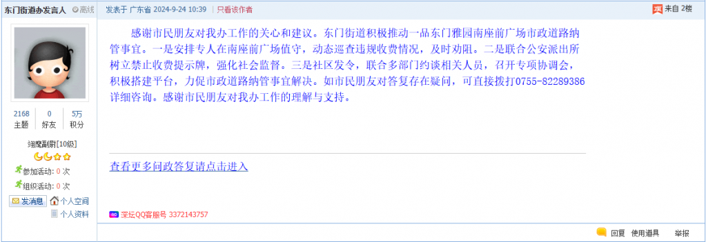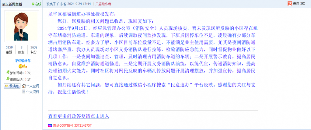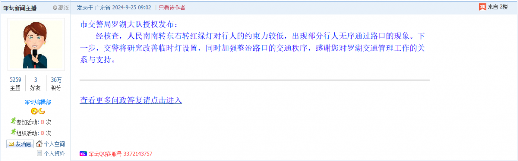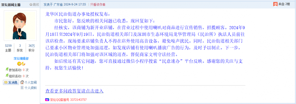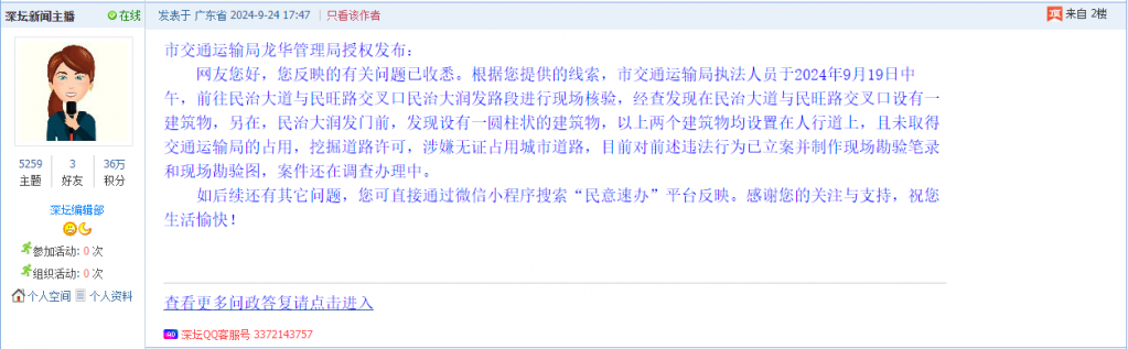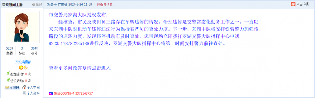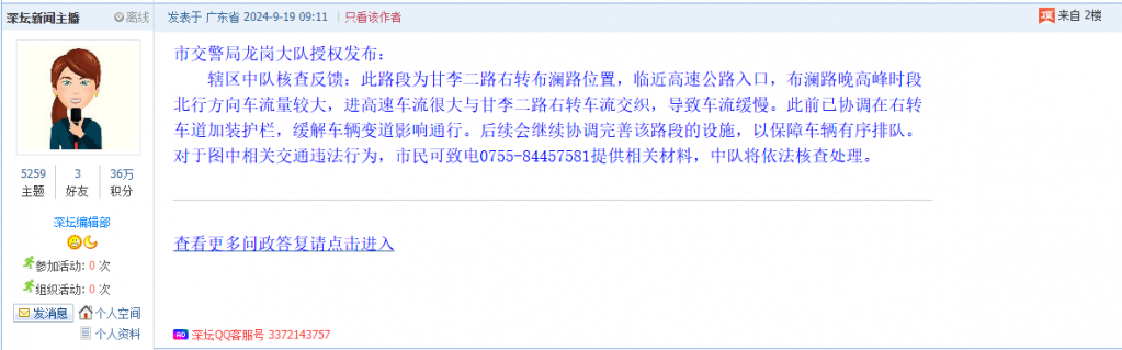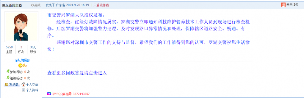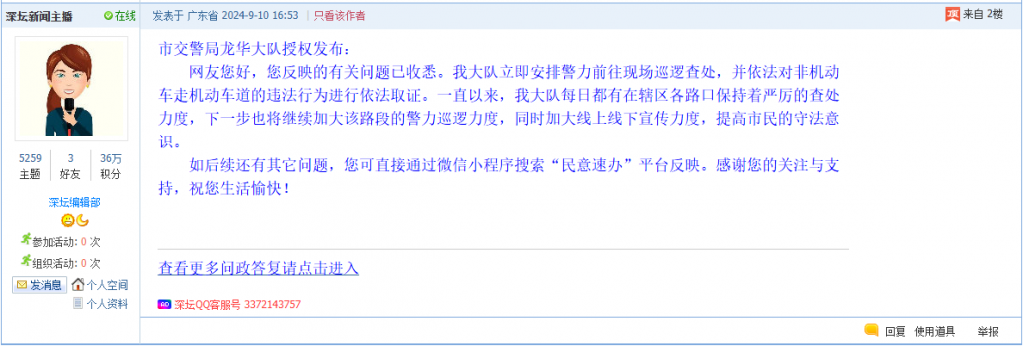 各职能单位如需对网友反映的问题进行回应,可在深圳论坛注册官方账号并通过认证,回帖进行回应。