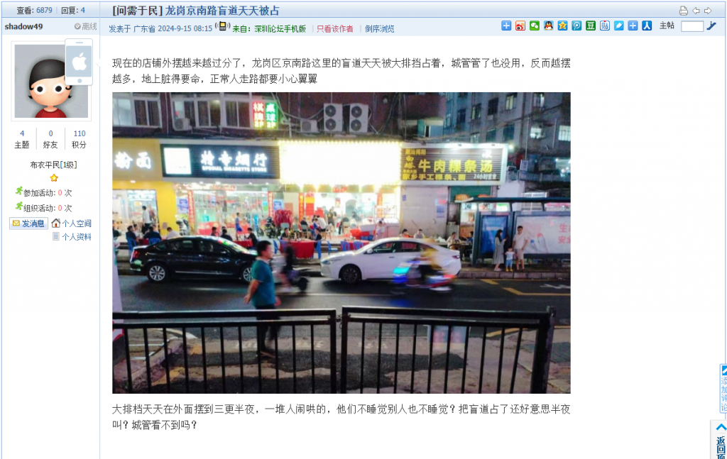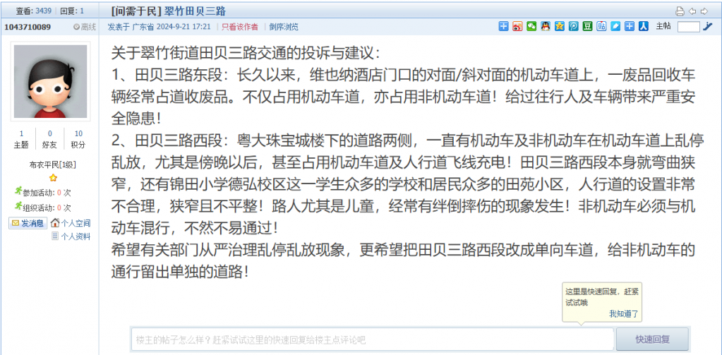 1. 帖文《龙华的早晚高峰交通秩序乱哄哄,电鸡乱停乱放》