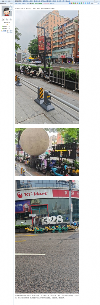 18. 帖文《深圳民治大润发,物业人员,把电动车移到公交车道,共享单车共享电动车》