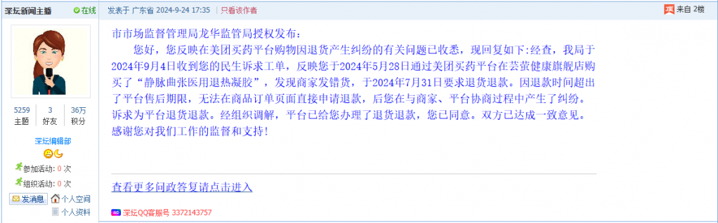 7. 帖文《投诉深圳市市场监管局龙华监管局及美团平台》