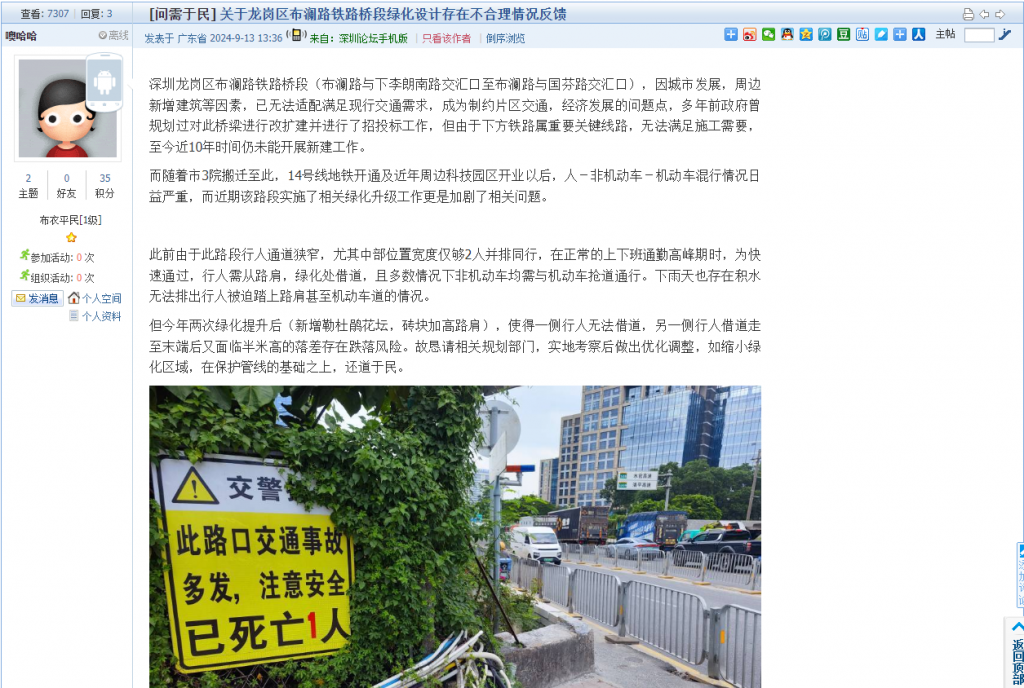 42. 帖文《关于龙岗区布澜路铁路桥段绿化设计存在不合理情况反馈》