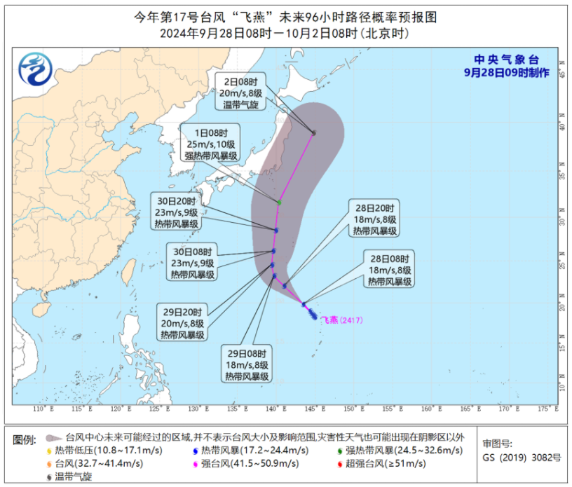 第17号台风“飞燕”继续向日本东南部洋面靠近,今日11时15分,其中心位于日本东京偏南方大约1050公里的西北太平洋洋面上,预计“飞燕”对我国海域无影响,将在海上默默发展,然后消亡。