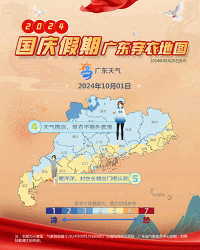 假期前期(10月1日-3日),受中等强度冷空气影响,广东省过程平均气温下降4~7℃,各市陆地有5~7级阵风,晨晚清凉注意添衣。