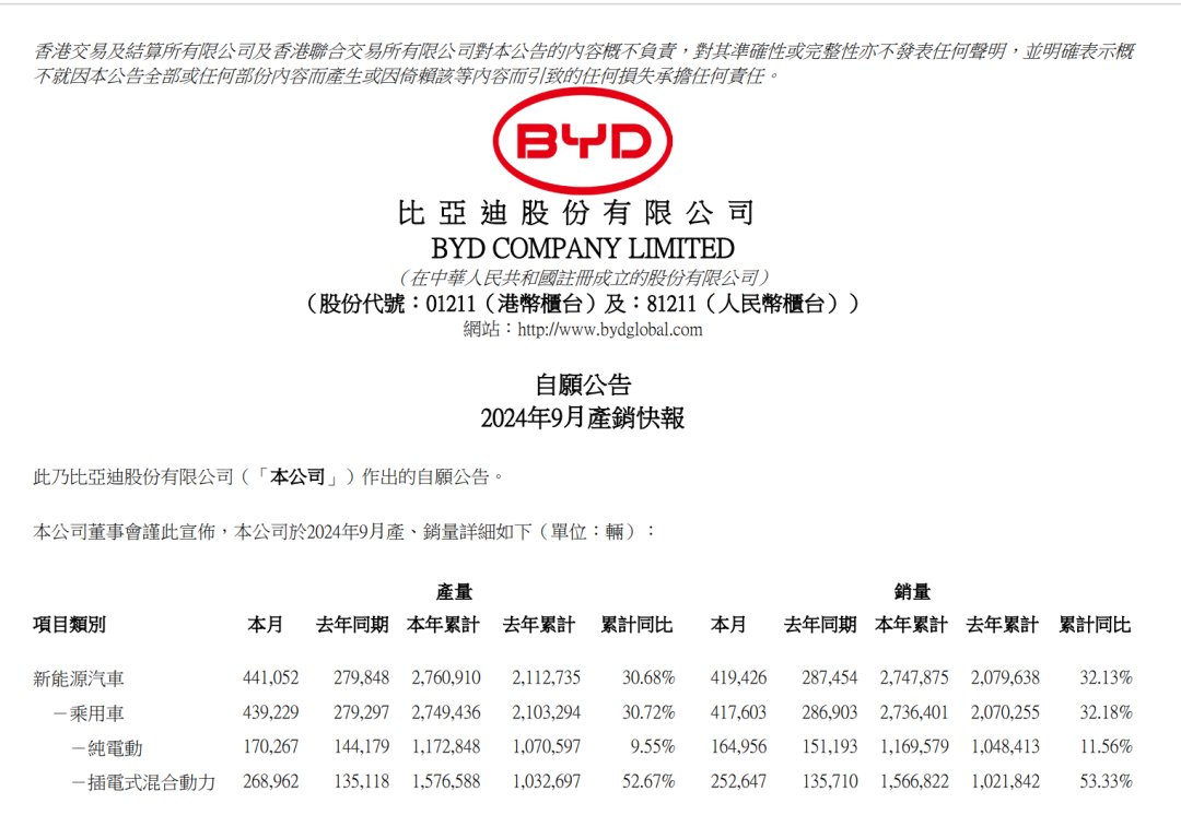 10月1日,比亚迪披露公告称,9月新能源汽车销量41.94万辆,同比增长45.91%。前9月,公司累计新能源汽车销量274.79万辆,同比增长32.13%。