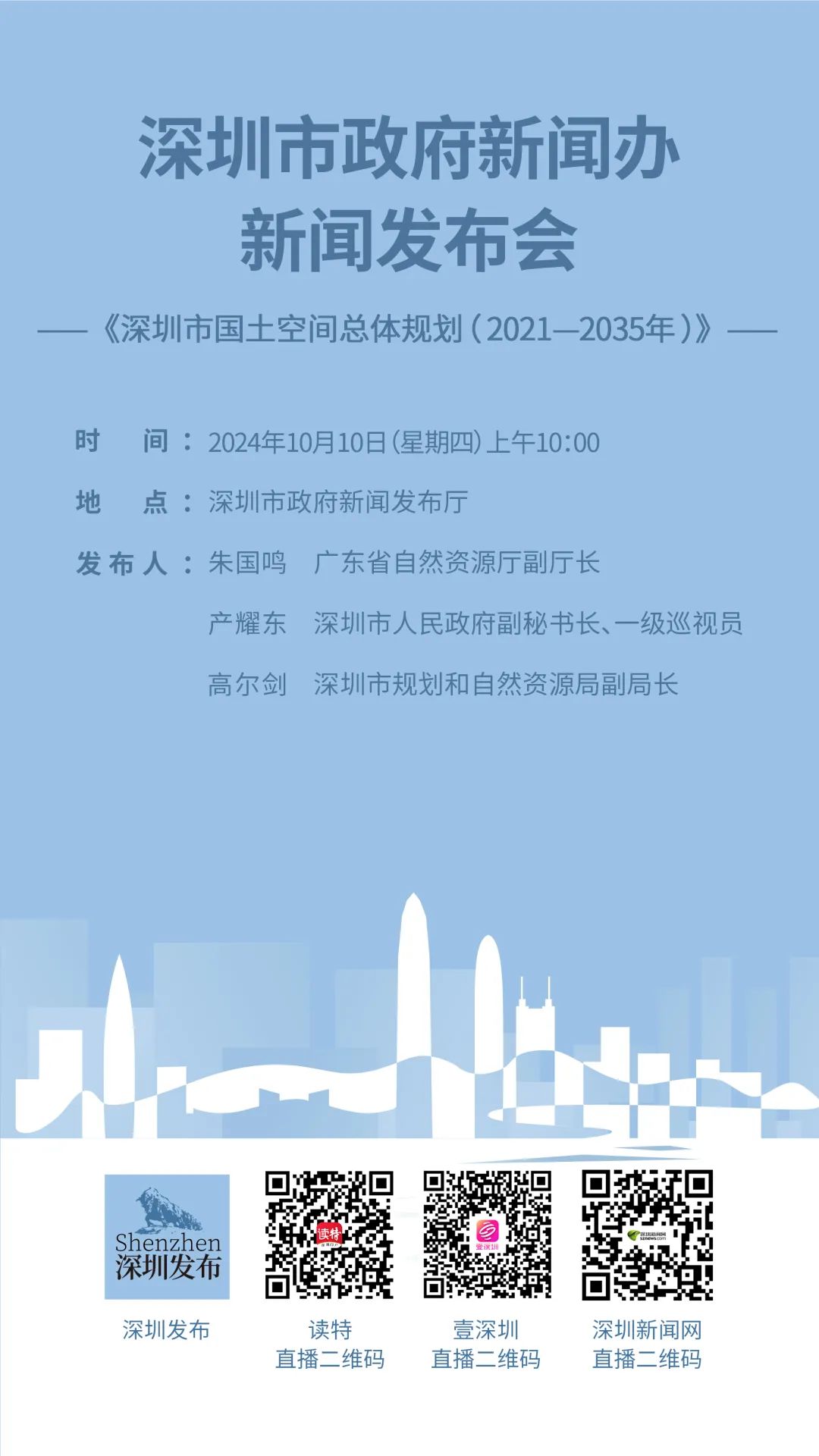 2024年10月10日(星期四)上午10:00,我市将举行新闻发布会,广东省自然资源厅、深圳市政府、市规划和自然资源局有关负责人出席,介绍《深圳市国土空间总体规划(2021—2035年)》相关情况,并回答记者提问,敬请关注。