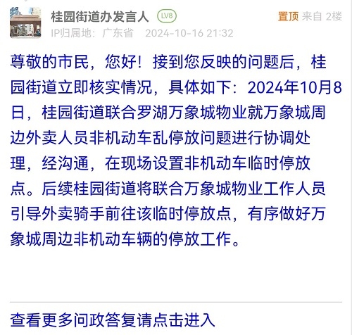 尊敬的市民,您好!接到您反映的问题后,桂园街道立即核实情况,具体如下:2024年10月8日,桂园街道联合罗湖万象城物业就万象城周边外卖人员非机动车乱停放问题进行协调处理,经沟通,在现场设置非机动车临时停放点。后续桂园街道将联合万象城物业工作人员引导外卖骑手前往该临时停放点,有序做好万象城周边非机动车辆的停放工作。
