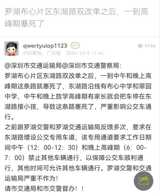 6. 帖文《罗湖布心片区东湖路双改单之后,一到高峰期塞死了》