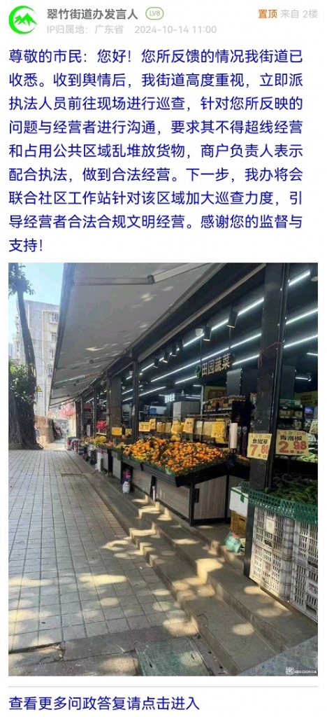 尊敬的市民:您好!您所反馈的情况我街道已收悉。收到舆情后,我街道高度重视,立即派执法人员前往现场进行巡查,针对您所反映的问题与经营者进行沟通,要求其不得超线经营和占用公共区域乱堆放货物,商户负责人表示配合执法,做到合法经营。下一步,我办将会联合社区工作站针对该区域加大巡查力度,引导经营者合法合规文明经营。感谢您的监督与支持!