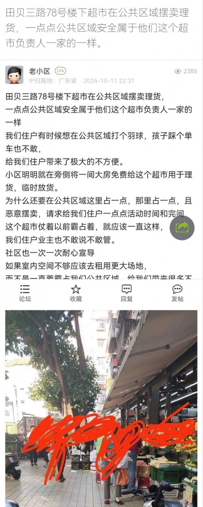14. 帖文《田贝三路78号楼下超市在公共区域摆卖理货,一点点公共区域安全属于他们这个超市负责人一家的一样。》