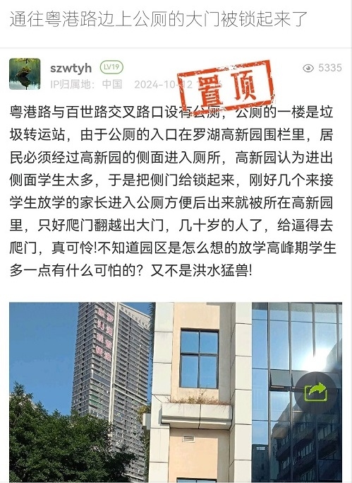 15. 帖文《通往粤港路边上公厕的大门被锁起来了》