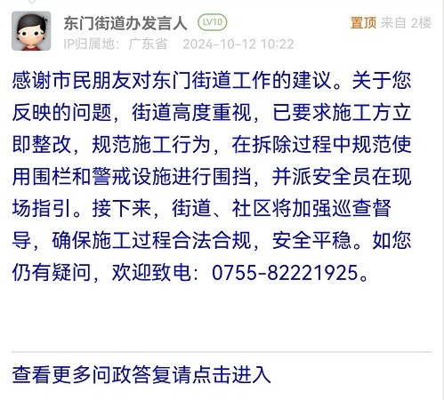 感谢市民朋友对东门街道工作的建议。关于您反映的问题,街道高度重视,已要求施工方立即整改,规范施工行为,在拆除过程中规范使用围栏和警戒设施进行围挡,并派安全员在现场指引。接下来,街道、社区将加强巡查督导,确保施工过程合法合规,安全平稳。如您仍有疑问,欢迎致电:0755-82221925。