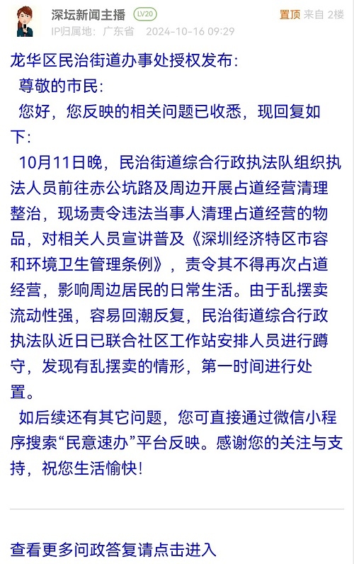 16. 帖文《龙华区白石龙赤公坑路占道经营扰民》
