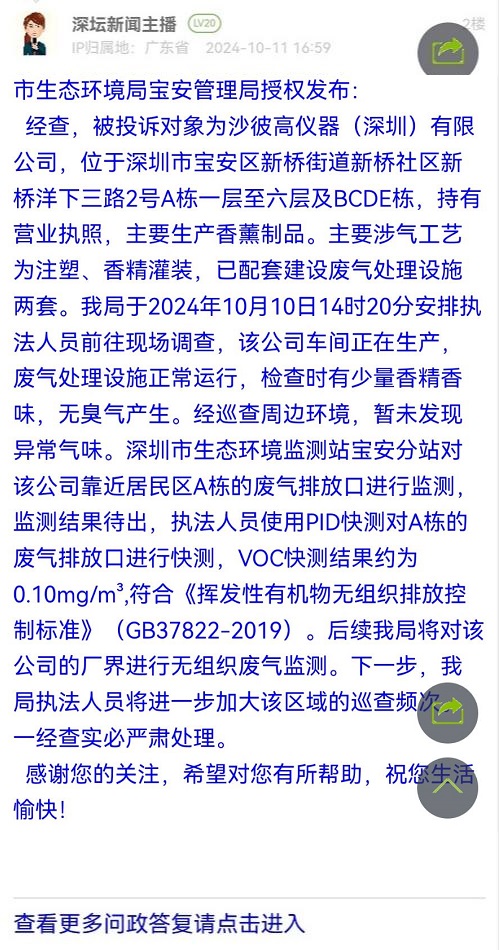 经查,被投诉对象为沙彼高仪器(深圳)有限公司,位于深圳市宝安区新桥街道新桥社区新桥洋下三路2号A栋一层至六层及BCDE栋,持有营业执照,主要生产香薰制品。主要涉气工艺为注塑、香精灌装,已配套建设废气处理设施两套。我局于2024年10月10日14时20分安排执法人员前往现场调查,该公司车间正在生产,废气处理设施正常运行,检查时有少量香精香味,无臭气产生。经巡查周边环境,暂未发现异常气味。深圳市生态环境监测站宝安分站对该公司靠近居民区A栋的废气排放口进行监测,监测结果待出,执法人员使用PID快测对A栋的废气排放口进行快测,VOC快测结果约为0.10mg/m³,符合《挥发性有机物无组织排放控制标准》(GB37822-2019)。后续我局将对该公司的厂界进行无组织废气监测。下一步,我局执法人员将进一步加大该区域的巡查频次。一经查实必严肃处理。感谢您的关注,希望对您有所帮助,祝您生活愉快!