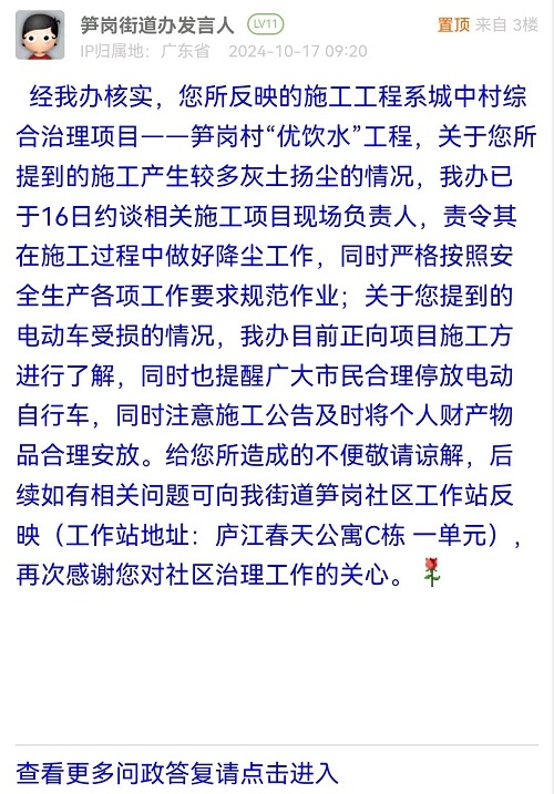 经我办核实,您所反映的施工工程系城中村综合治理项目——笋岗村“优饮水”工程,关于您所提到的施工产生较多灰土扬尘的情况,我办已于16日约谈相关施工项目现场负责人,责令其在施工过程中做好降尘工作,同时严格按照安全生产各项工作要求规范作业;关于您提到的电动车受损的情况,我办目前正向项目施工方进行了解,同时也提醒广大市民合理停放电动自行车,同时注意施工公告及时将个人财产物品合理安放。给您所造成的不便敬请谅解,后续如有相关问题可向我街道笋岗社区工作站反映(工作站地址:庐江春天公寓C栋 一单元),再次感谢您对社区治理工作的关心。