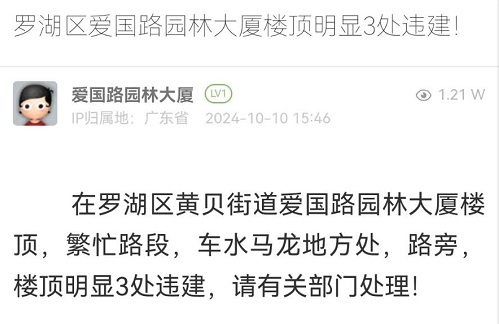 22. 帖文《罗湖区爱国路园林大厦楼顶明显3处违建!》