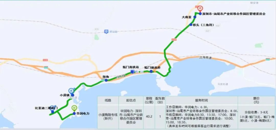 为方便深圳市深汕特别合作区与周边地区的人员往来,近日,在深圳、汕尾两地交通运输部门的指导支持下,深汕巴士公司正式开通运营深汕小漠至海丰梅陇公交专线。