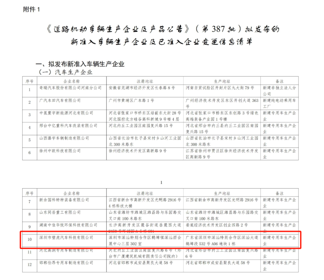 壁虎专用车生产工厂的获批